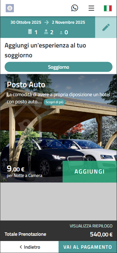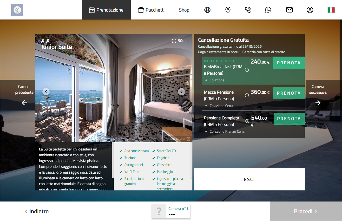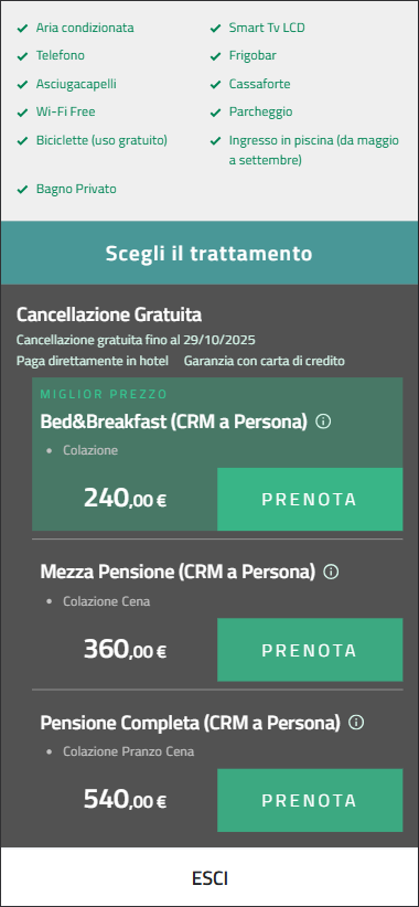 - Processo di Prenotazione Semplificato: Pochi click per scegliere la camera, aggiungere extra e completare il pagamento in modo sicuro.